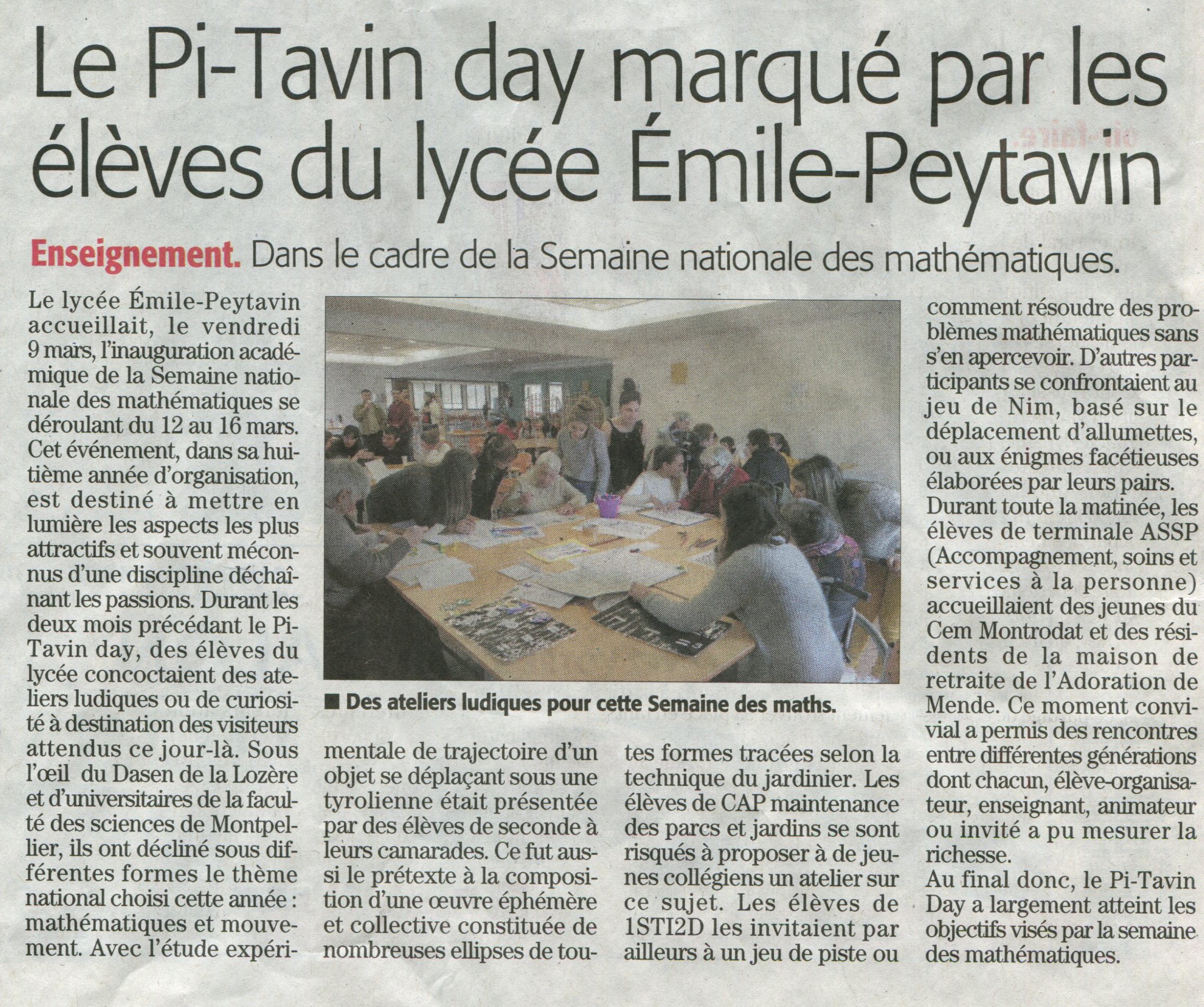 Opération phare : au lycée Peytavin de Mende, les « Pi-Tavin Days », tout un établissement se mobilise.